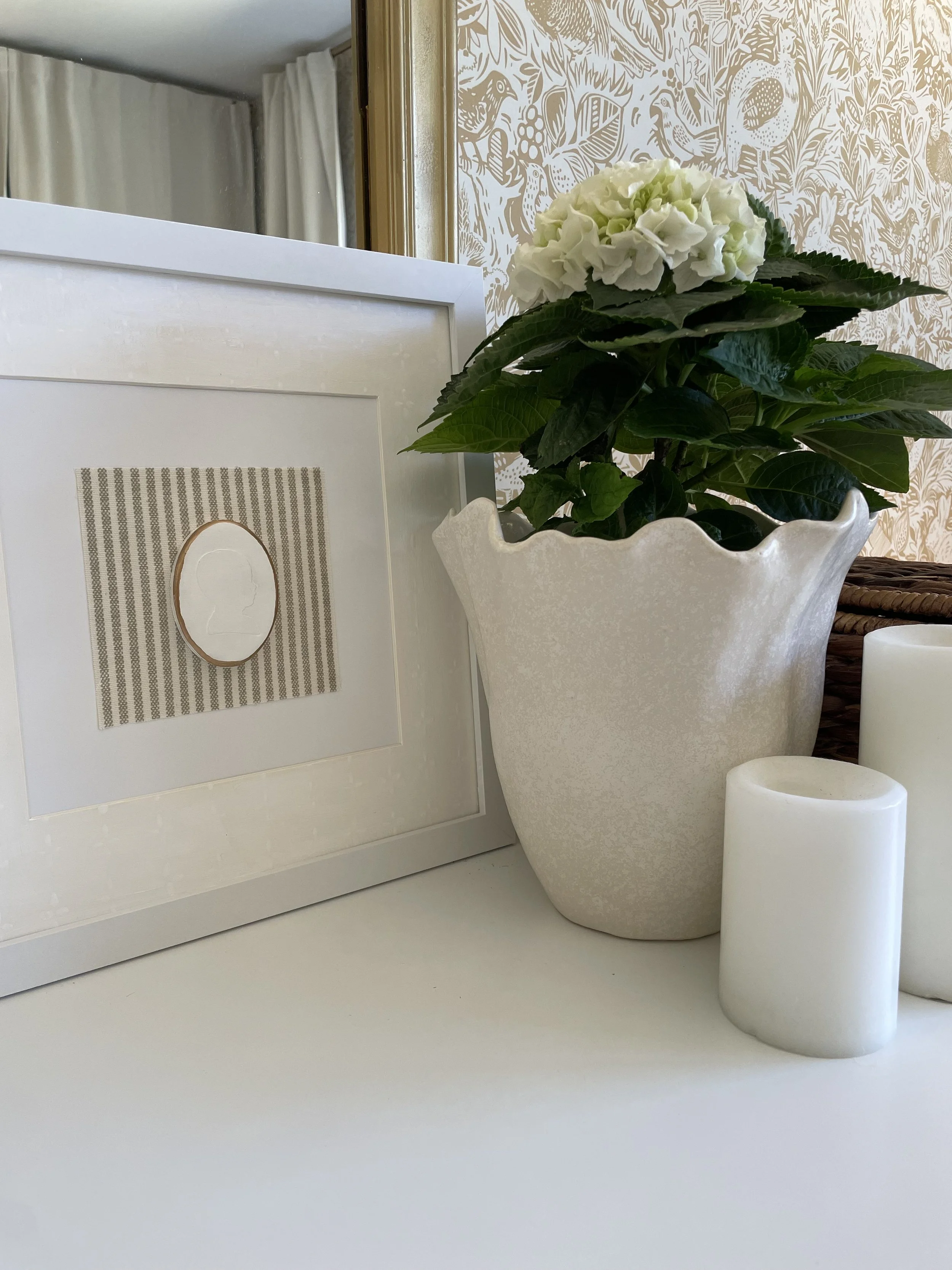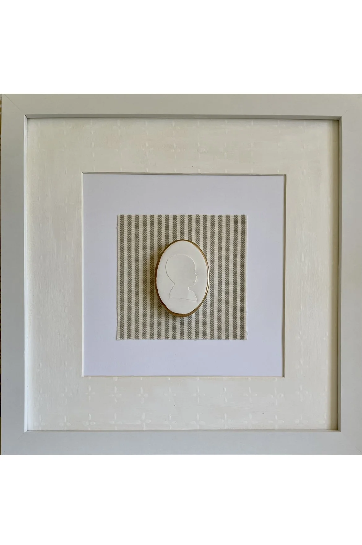$240 frame + off white mat + fabric + small custom heirloom intaglio